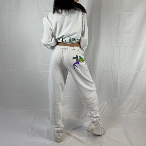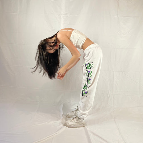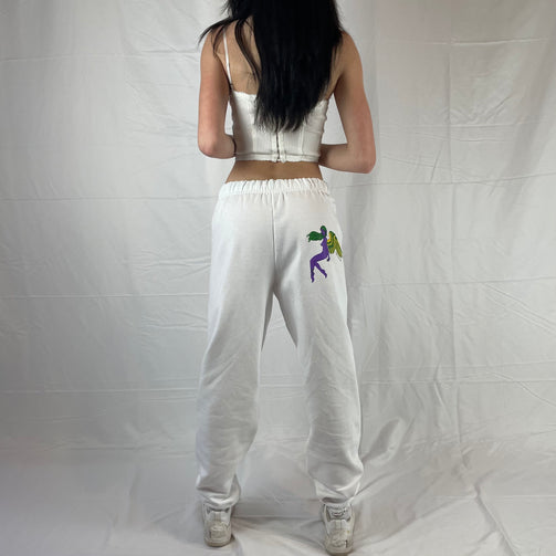 white unisex sweatpants with a purple fairy on the right butt and letters along the side of the left leg